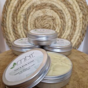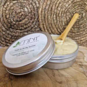 Shea butter heeft de eigenschap dat het vocht vasthoudt in de huid. Wij hebben de shea butter gecombineerd met koudgeperste plantaardige oliën met als resultaat een heerlijk smeerbare, voedende butter voor de dagelijkse huidverzorging. De voet & body butter zit vol met essentiële vetzuren en de vitamines A, E en F. Hierdoor werkt hij hydraterend en ondersteunt het herstellend vermogen van de huid.